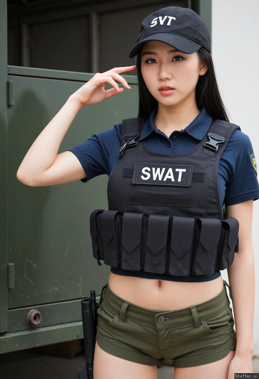 absurd res, 8k, perfect anatomy, masterpiece, 19 year old chinese woman, stunning pretty face, cute tactical swat agent, ,((black tactical swat vest)), beautiful chinky chinese face , beautiful small chinese eyes, cute straight black hair, very chinese supermodel, navy polo top, short sleeve polo green cargo_shorts, thicc, black baseball cap, SWAT special forces spy, swat agent, cargo dock, seductive face, exposed belly