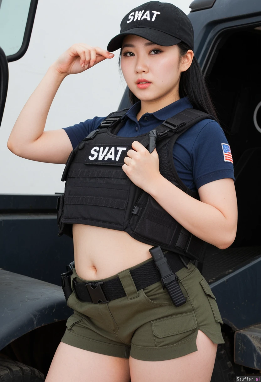 absurd res, 8k, front view, perfect anatomy, masterpiece, 19 year old chinese woman, pretty face, cute tactical swat agent, ,((black tactical swat vest)), beautiful chinky chinese face , beautiful small chinese eyes, cute straight black hair, very chinese supermodel, navy polo top, short sleeve polo green cargo_shorts, (thicc), thighs, black baseball cap, SWAT special forces spy, swat agent, cargo dock, playful face, exposed belly, wide hips, chubby, fat, belly