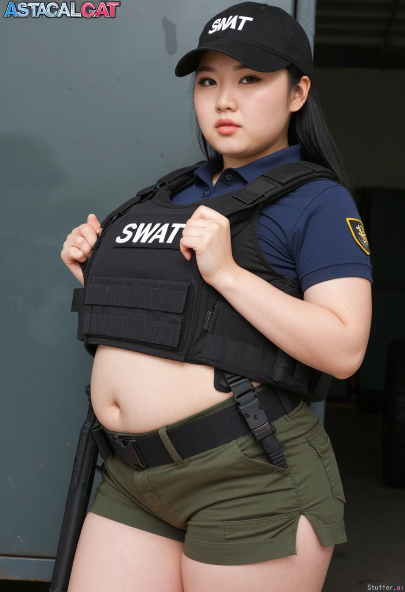 absurd res, 8k, front view, perfect anatomy, masterpiece, 19 year old chinese woman, pretty face, cute tactical swat agent, ,((black tactical swat vest)), beautiful chinky chinese face , beautiful small chinese eyes, cute straight black hair, very chinese plus size supermodel, navy polo top, short sleeve polo green cargo_shorts, (thicc), thighs, black baseball cap, SWAT special forces spy, swat agent, cargo dock, playful face, exposed belly, wide hips, (chubby), (fat), belly, big girl