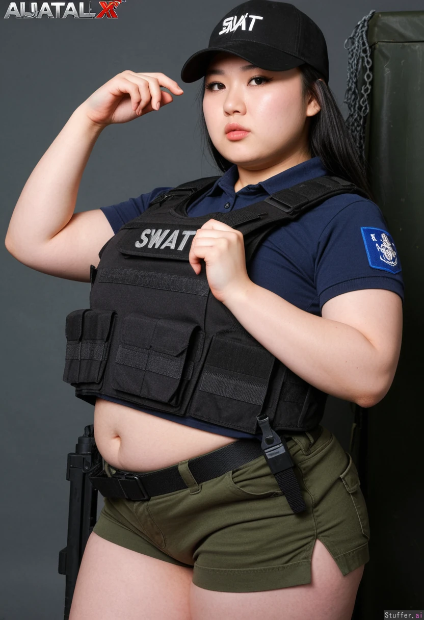 absurd res, 8k, front view, perfect anatomy, masterpiece, 19 year old chinese woman, pretty face, cute tactical swat agent, ,((black tactical swat vest)), beautiful chinky chinese face , beautiful small chinese eyes, cute straight black hair, very chinese plus size supermodel, (navy polo top), (short sleeve polo), green cargo_shorts, (thicc), thighs, black baseball cap, SWAT special forces spy, swat agent, cargo dock, playful face, exposed belly, wide hips, ((chubby)), (fat), belly, big girl, fat arms
