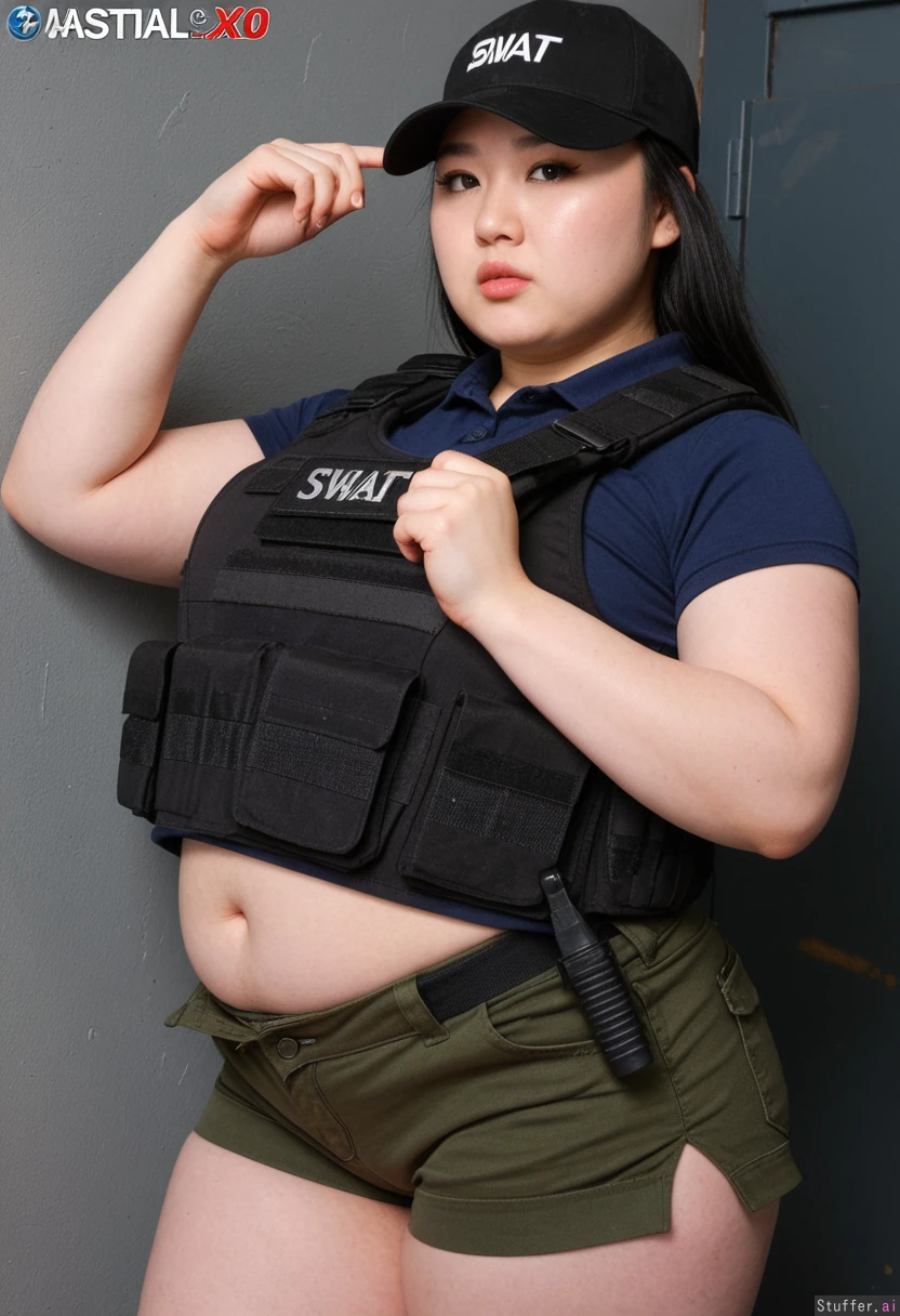 absurd res, 8k, front view, perfect anatomy, masterpiece, 19 year old chinese woman, pretty face, cute tactical swat agent, ,((black tactical swat vest)), beautiful chinky chinese face , beautiful small chinese eyes, cute straight black hair, very chinese plus size supermodel, (navy polo top), (short sleeve polo), green cargo_shorts, (thicc), thighs, black baseball cap, SWAT special forces spy, swat agent, cargo dock, playful face, exposed belly, wide hips, ((chubby)), ((fat)), (belly), (big girl), (fat arms)