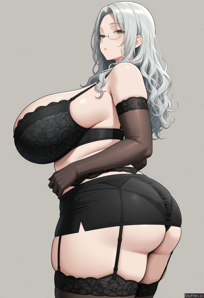 (by oekakizuki), side view, simple background, 1woman, (larger female), (mature female), gray hair, wide hips, overweight, curvy, half-closed eyes, glasses, rimless eyewear, huge breasts, huge ass, thick thighs, sagging breasts, black bra, black panties, black gloves, black thighighs, garter belt, lingerie, thighighs, elbow glove, panties skirt, gray eyes, long hair, fluffy hair, curtained hair, standing, highres, masterpiece, best quality, amazing quality,