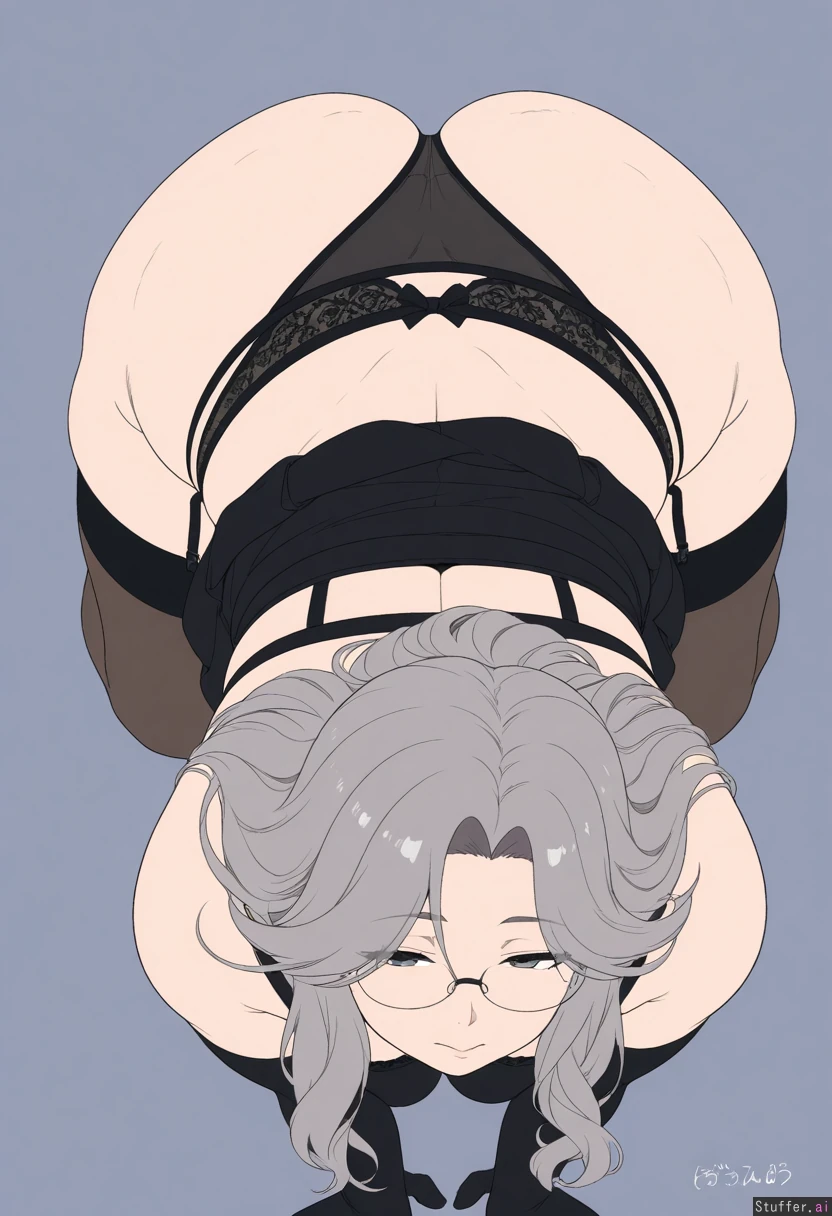 (by masuyama_ryou), ((flat colors)), back view, simple background, 1woman, (larger female), (mature female), gray hair, wide hips, chubby, (((cellulite))), overweight, curvy, half-closed eyes, glasses, rimless eyewear, huge breasts, huge ass, thick thighs, sagging breasts, black bra, black panties, black gloves, black thighighs, garter belt, lingerie, thighighs, bow panties, elbow glove, lingerie skirt, gray eyes, long hair, fluffy hair, curtained hair, all fours, highres, masterpiece, best quality, amazing quality,