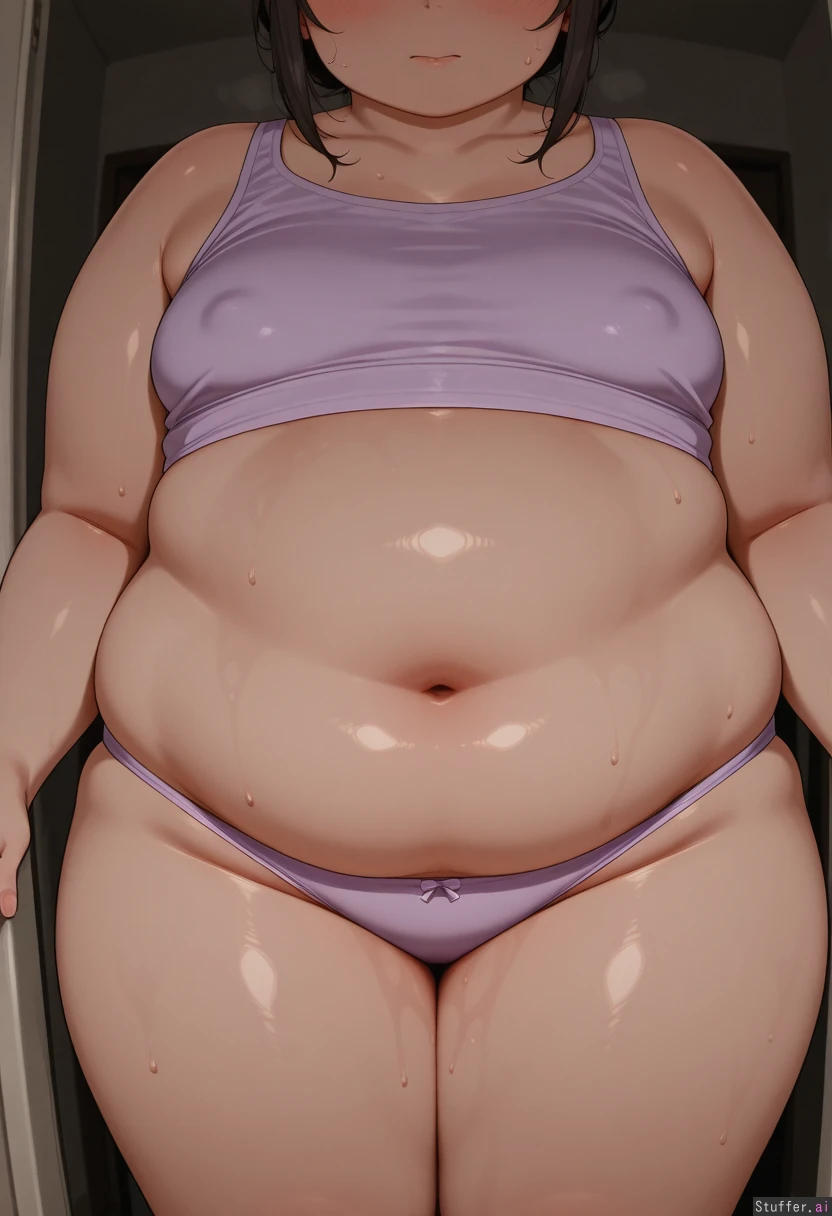 solo, 1girl , first_person_view , light_purple_shirt , light_purple_underwear , bath_scale , dark_room , sweat , small_breasts , ((fat , fat_belly , fat_butt , fat_thighs , fat_arms ):1.0) ,