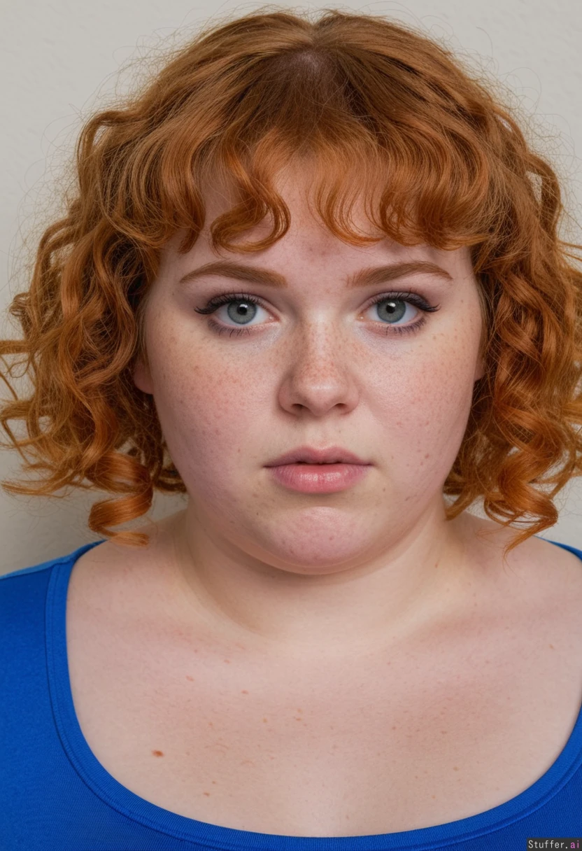 ((Highly realistic:1.9)) (25 year old) (beautiful face:1.2) ((extremely fat)) Short curly ginger hair with bangs Bored at school