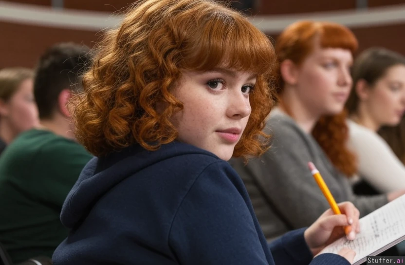 ((Highly realistic:1.9)) (21 year old) (beautiful face:1.2) ((extremely fat)) Short curly ginger hair with bangs Writing notes in university lecture hall, surrounded by other students.