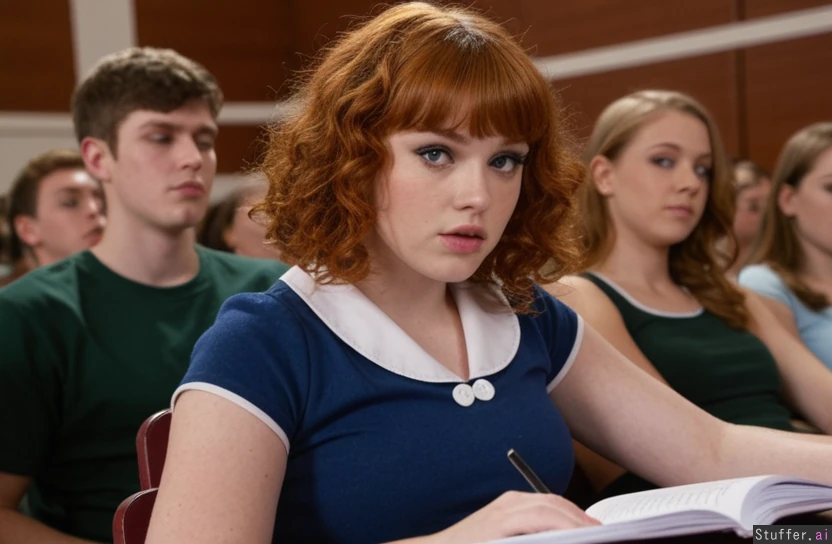 ((Highly realistic:1.9)) (21 year old) (beautiful face:1.2) HD Movie scene ((extremely fat)) Short curly ginger hair with bangs Writing notes in university lecture hall, surrounded by other students.