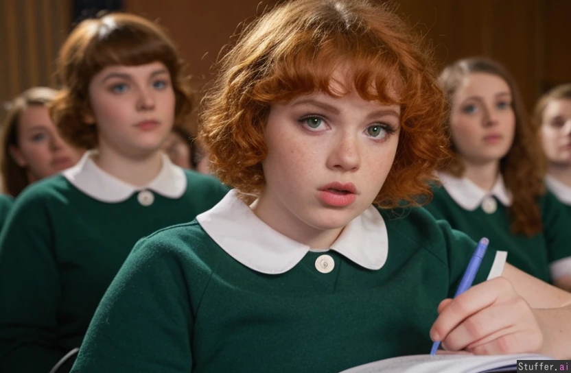 ((Highly realistic:1.9)) (21 year old) (beautiful face:1.2) HD Movie scene (Chubby) Soft lips Puffy cheeks Green eyes Short curly ginger hair with bangs Writing notes in university lecture hall, surrounded by other students.