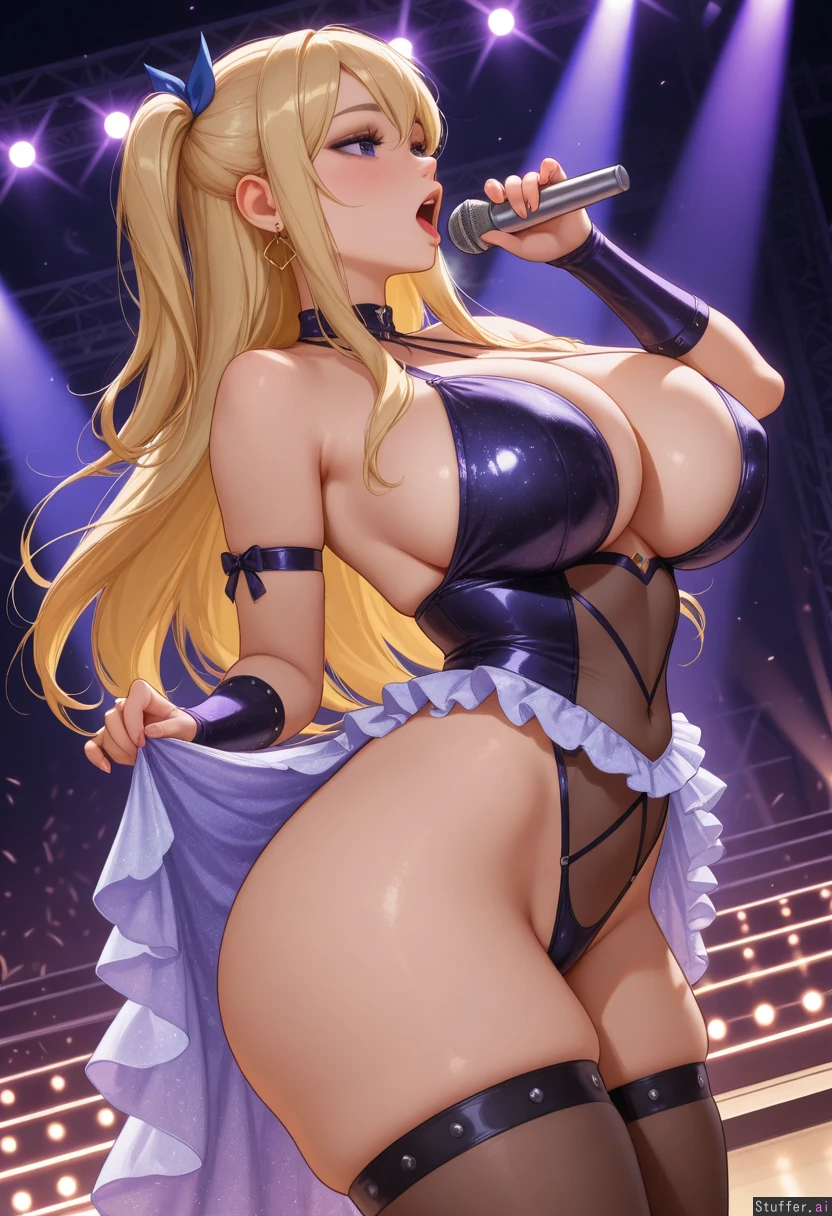 prywinko(artist), kittew(artist), (wide view:1.4, one view, one angle, single scene), 1girl Lucy Heartfilia **facial features** long blonde hair, lusty expression, open mouth, heavy breathing **clothing** (Hyper lewd popstar outfit) **body features** big breasts (massive belly longer than body:0.0), ((gigantic belly:0.0), ((super-soft belly:0.0), belly overflow: 0.0, belly overhang: 0.0)), ((Obese, overweight: 0.0)), ((thick thighs: 0.0)), (hyper belly:0.0), ((big belly:0.0)), **actions and pose** hands lifted up, ((singing and dancing on a stage)) **angle and location** Concert stage, stage lights, low warm lighting, ((at night)), ((sideview))
