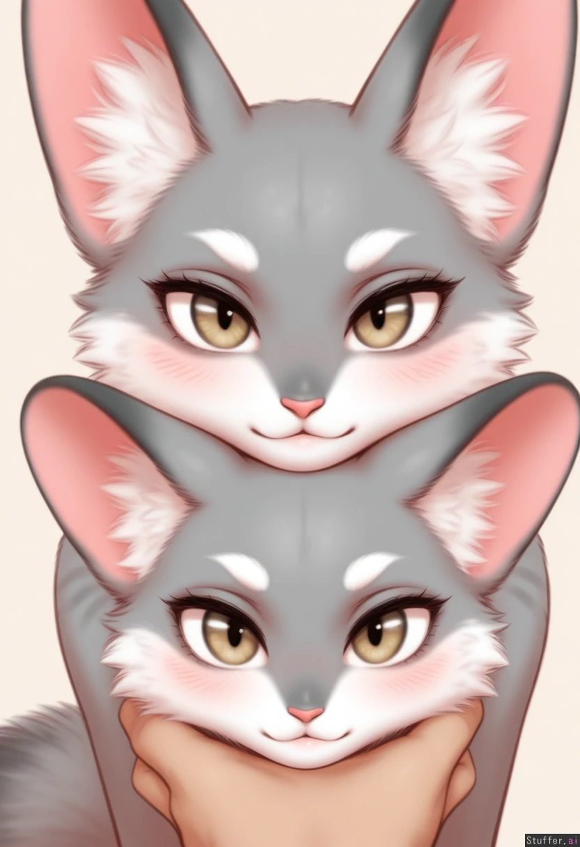 (by shpo), upper body view, straight-on, simple background, 1anthro, 1man, duo, anthro female, pulchra_fellini, animal ears, animal ears fluff, animal tail, highres, masterpiece, best quality, amazing quality,