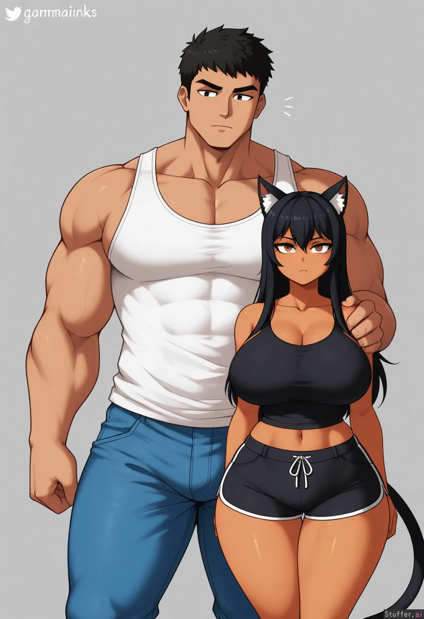 (by gammainks), cowboy shot, simple background, 1woman, 1man, duo, dark skin, animal ears, animal ears fluff, animal tail, curvy, long hair, cat ears, cat tail, white tank top, blue jeans, side by side, tall male, human, muscular, short hair, serious, black shirt, black shorts, highres, masterpiece, best quality, amazing quality,