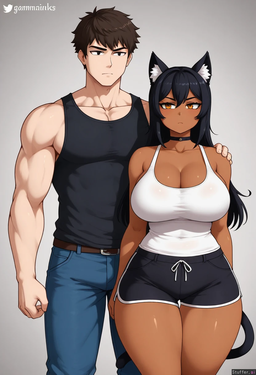(by gammainks), cowboy shot, simple background, 1woman, 1man, duo, female, dark skin, animal ears, animal ears fluff, animal tail, curvy, long hair, cat ears, cat tail, white tank top, blue jeans, side by side, male, human, short hair, serious, black shirt, black shorts, highres, masterpiece, best quality, amazing quality,