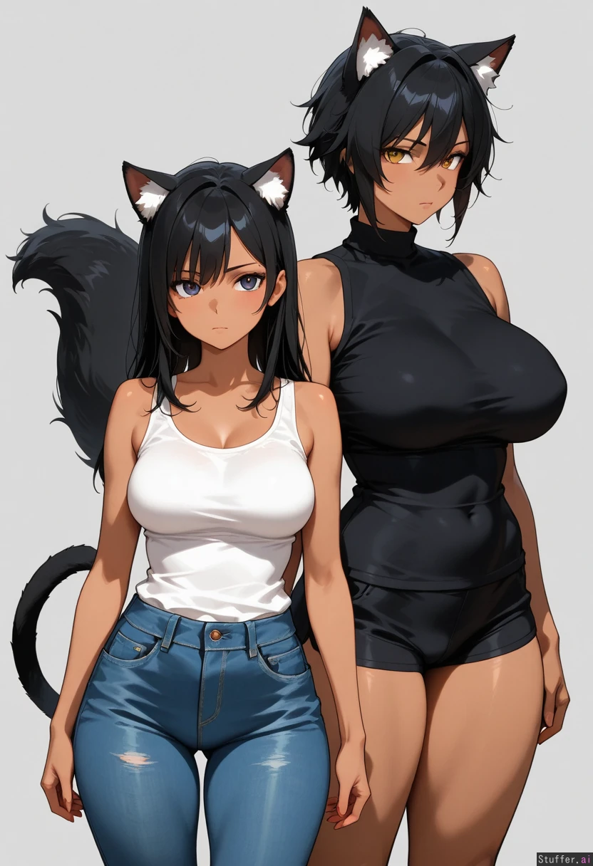 cowboy shot, simple background, 1woman, 1man, duo, female, dark skin, animal ears, animal ears fluff, animal tail, curvy, long hair, cat ears, cat tail, white tank top, blue jeans, side by side, male, human, short hair, serious, black shirt, black shorts, highres, masterpiece, best quality, amazing quality,