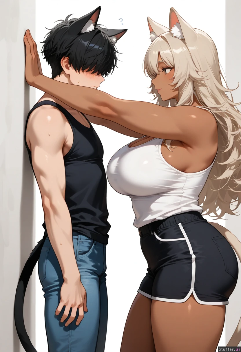 cowboy shot, simple background, 1woman, 1man, duo, tall female, dark skin, animal ears, animal ears fluff, animal tail, curvy, long hair, cat ears, cat tail, white tank top, blue jeans, kabedon, male, short hair, muscular male, nervous male, fluffy hair, bangs over eyes, mouse ears, mouse tail, black shirt, black shorts, highres, masterpiece, best quality, amazing quality,