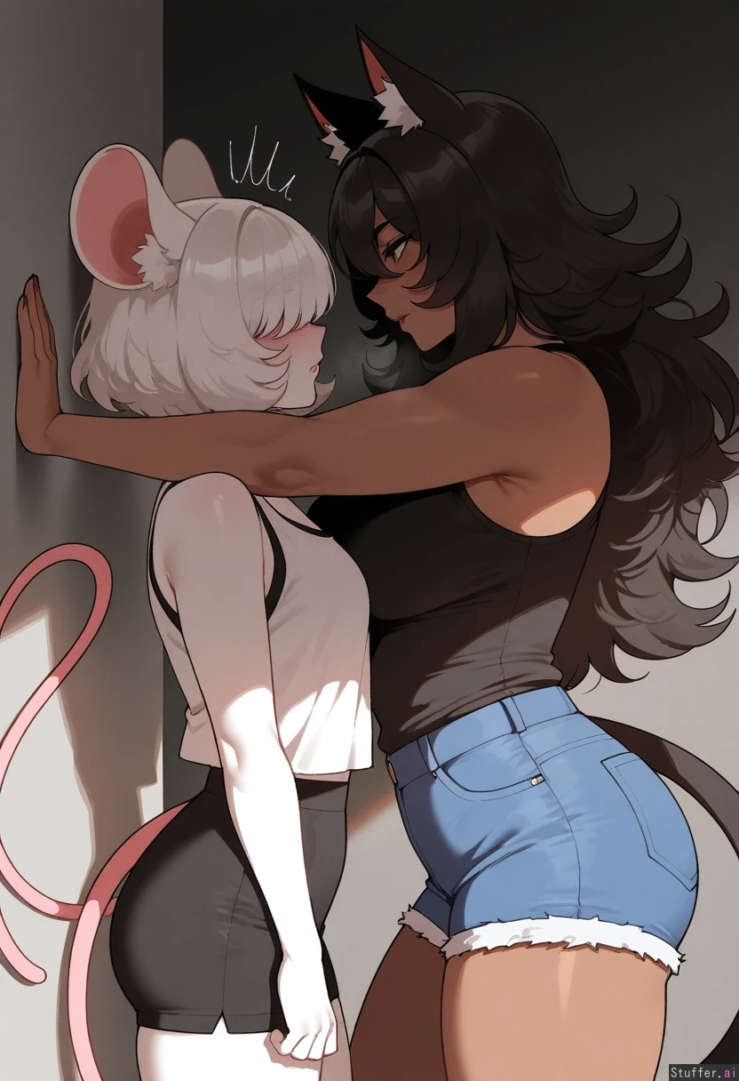 by nyantcha, cowboy shot, simple background, 2woman, duo, animal ears, animal ears fluff, animal tail, yuri, dominant female, dark skin, curvy, long hair, cat ears, cat tail, white tank top, blue jeans, kabedon, submissive female, petite, white skin, short hair, nervous, fluffy hair, bangs over eyes, mouse ears, mouse tail, black shirt, black shorts, highres, masterpiece, best quality, amazing quality,