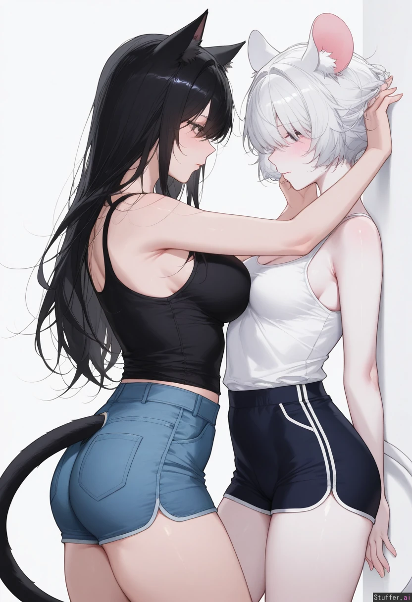 by qiandaiyiyu, cowboy shot, simple background, 2woman, duo, animal ears, animal ears fluff, animal tail, yuri, dominant female, dark skin, curvy, long hair, black hair, cat ears, cat tail, white tank top, blue shorts, holding another's jaw, kabedon, submissive female, petite, white skin, short hair, white hair, nervous, fluffy hair, bangs over eyes, mouse ears, mouse tail, black shirt, black shorts, highres, masterpiece, best quality, amazing quality,