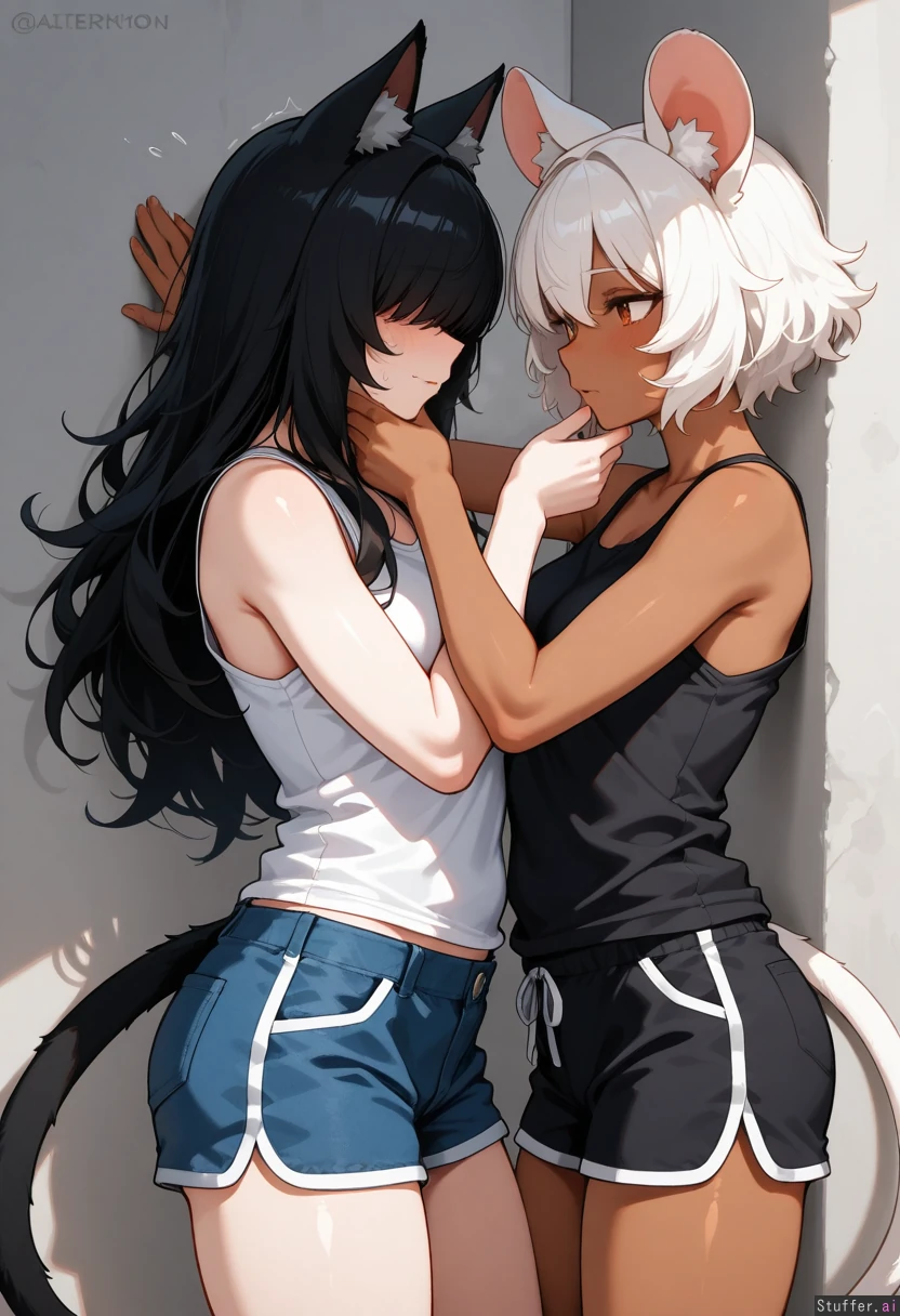 by alterkyon, cowboy shot, simple background, 2woman, duo, animal ears, animal ears fluff, animal tail, yuri, dominant female, dark skin, curvy, long hair, black hair, cat ears, cat tail, white tank top, blue shorts, holding another's chin, kabedon, submissive female, petite, white skin, short hair, white hair, nervous, fluffy hair, bangs over eyes, mouse ears, mouse tail, black shirt, black shorts, highres, masterpiece, best quality, amazing quality,
