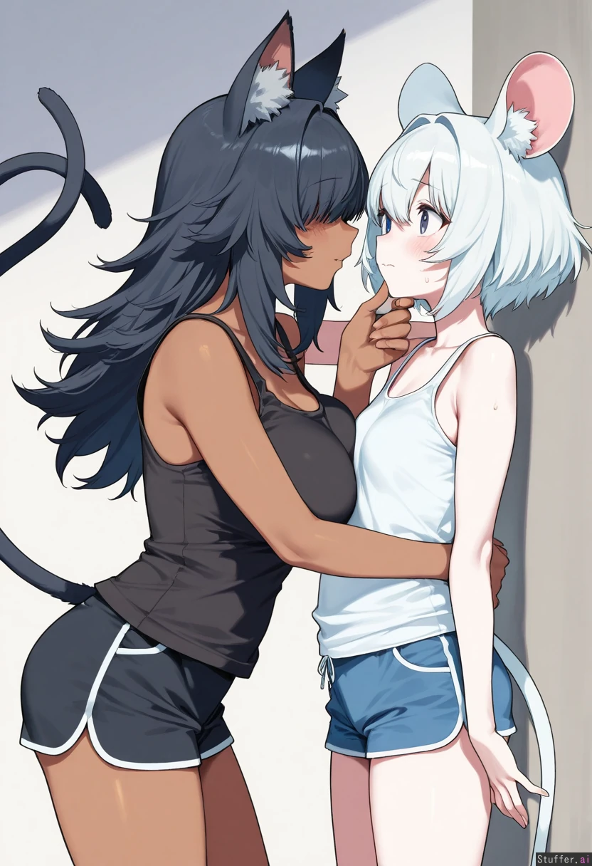 by nonco, cowboy shot, simple background, 2woman, duo, animal ears, animal ears fluff, animal tail, yuri, dominant female, dark skin, curvy, long hair, black hair, cat ears, cat tail, white tank top, blue shorts, holding other chin, kabedon, submissive female, petite, white skin, short hair, white hair, nervous, fluffy hair, bangs over eyes, mouse ears, mouse tail, black shirt, black shorts, highres, masterpiece, best quality, amazing quality,