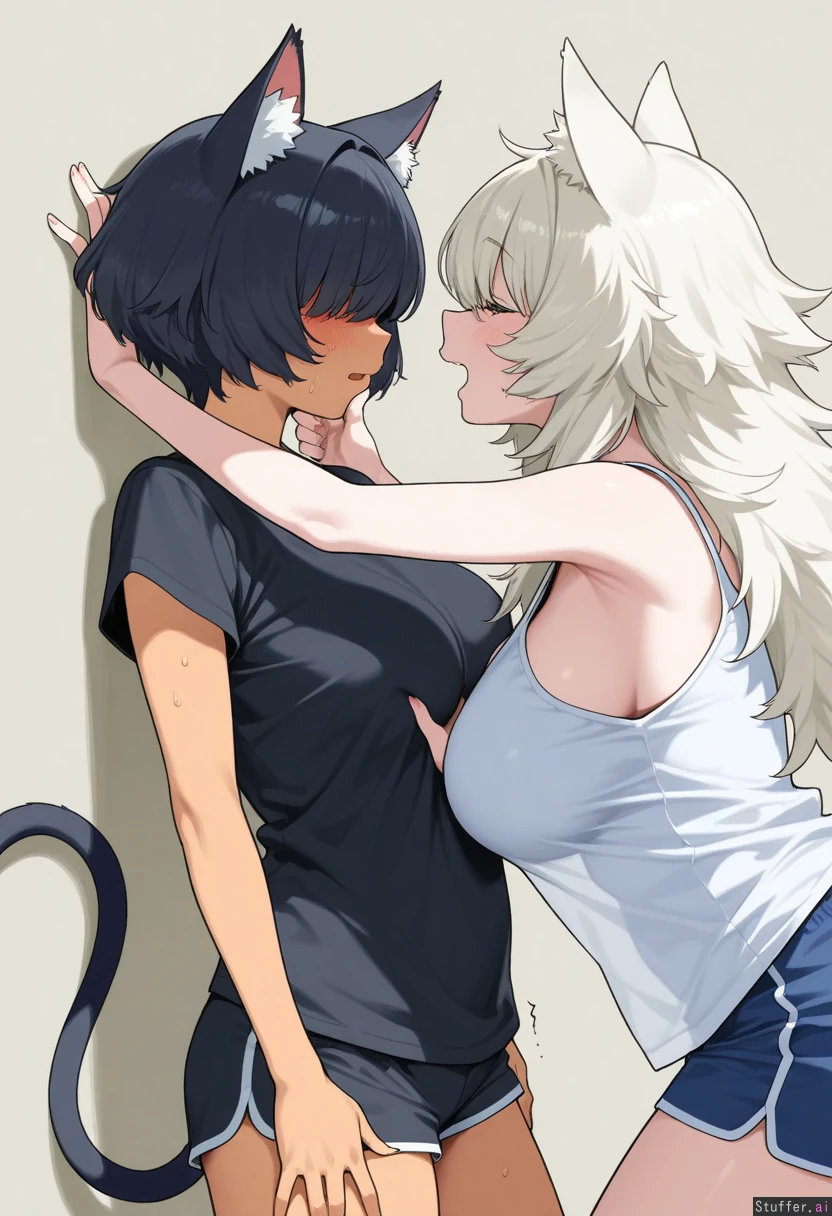 by nonco, cowboy shot, simple background, 2woman, duo, animal ears, animal ears fluff, animal tail, yuri, dominant female, dark skin, curvy, long hair, black hair, cat ears, cat tail, white tank top, blue shorts, grabbing_another's_chin, kabedon, submissive female, petite, white skin, short hair, white hair, nervous, fluffy hair, bangs over eyes, mouse ears, mouse tail, black shirt, black shorts, highres, masterpiece, best quality, amazing quality,