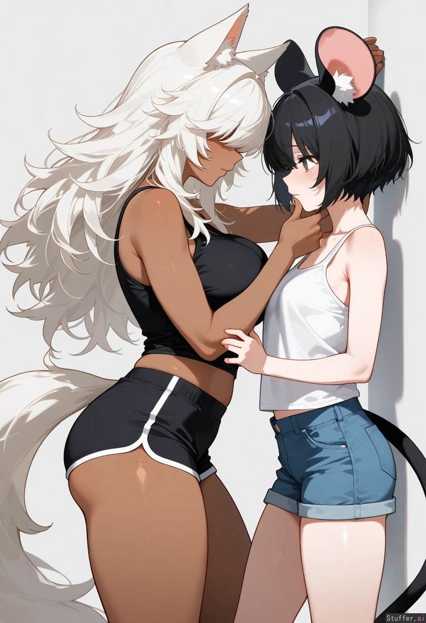by xipa, cowboy shot, simple background, 2woman, duo, animal ears, animal ears fluff, animal tail, yuri, dominant female, dark skin, curvy, long hair, black hair, cat ears, cat tail, white tank top, blue shorts, grabbing_another's_chin, kabedon, submissive female, petite, white skin, short hair, white hair, nervous, fluffy hair, bangs over eyes, mouse ears, mouse tail, black shirt, black shorts, highres, masterpiece, best quality, amazing quality,