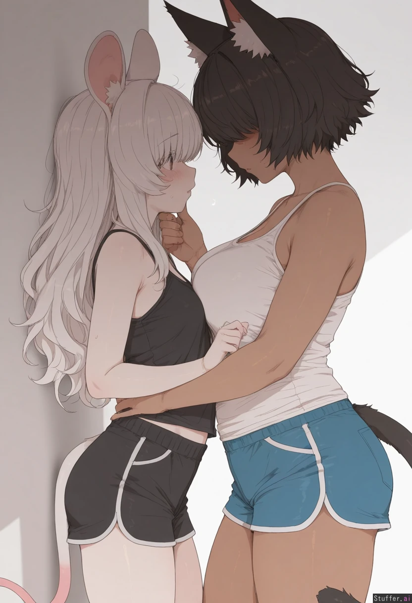 by mdf an, cowboy shot, simple background, 2woman, duo, animal ears, animal ears fluff, animal tail, yuri, dominant female, dark skin, curvy, long hair, black hair, cat ears, cat tail, white tank top, blue shorts, grabbing_another's_chin, kabedon, looking at each other, submissive female, petite, white skin, short hair, white hair, nervous, fluffy hair, bangs over eyes, mouse ears, mouse tail, black shirt, black shorts, highres, masterpiece, best quality, amazing quality,