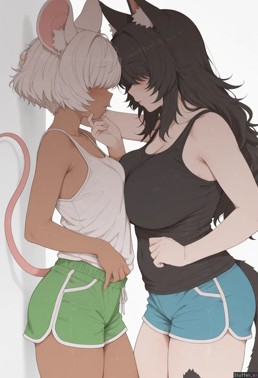 by mdf an, cowboy shot, simple background, 2woman, duo, animal ears, animal ears fluff, animal tail, yuri, dominant female, dark skin, curvy, long hair, black hair, cat ears, cat tail, white tank top, blue shorts, grabbing_another's_chin, kabedon, looking at each other, submissive female, petite, white skin, short hair, white hair, nervous, fluffy hair, bangs over eyes, mouse ears, mouse tail, black shirt, green shorts, highres, masterpiece, best quality, amazing quality,