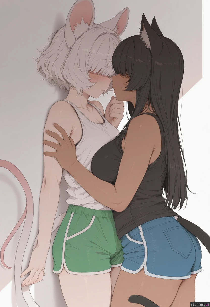 by mdf an, cowboy shot, simple background, 2woman, duo, animal ears, animal ears fluff, animal tail, yuri, dominant female, petite, dark skin, curvy, long hair, black hair, cat ears, cat tail, white tank top, blue shorts, grabbing_another's_chin, submissive against wall, looking at each other, submissive female, petite, white skin, short hair, white hair, nervous, fluffy hair, bangs over eyes, mouse ears, mouse tail, black shirt, green shorts, highres, masterpiece, best quality, amazing quality,