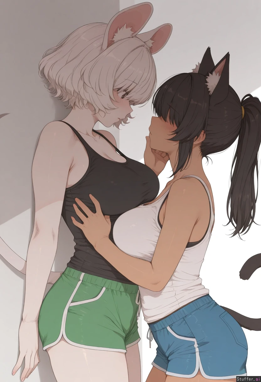 by mdf an, cowboy shot, simple background, 2woman, duo, animal ears, animal ears fluff, animal tail, yuri, dominant female, dark skin, curvy, long hair, ponytail, black hair, cat ears, cat tail, white tank top, blue shorts, grabbing_another's_chin, B-cup breasts, submissive against wall, looking at each other, submissive female, white skin, short hair, white hair, nervous, fluffy hair, bangs over eyes, mouse ears, mouse tail, black shirt, green shorts, A-cup breasts, highres, masterpiece, best quality, amazing quality,