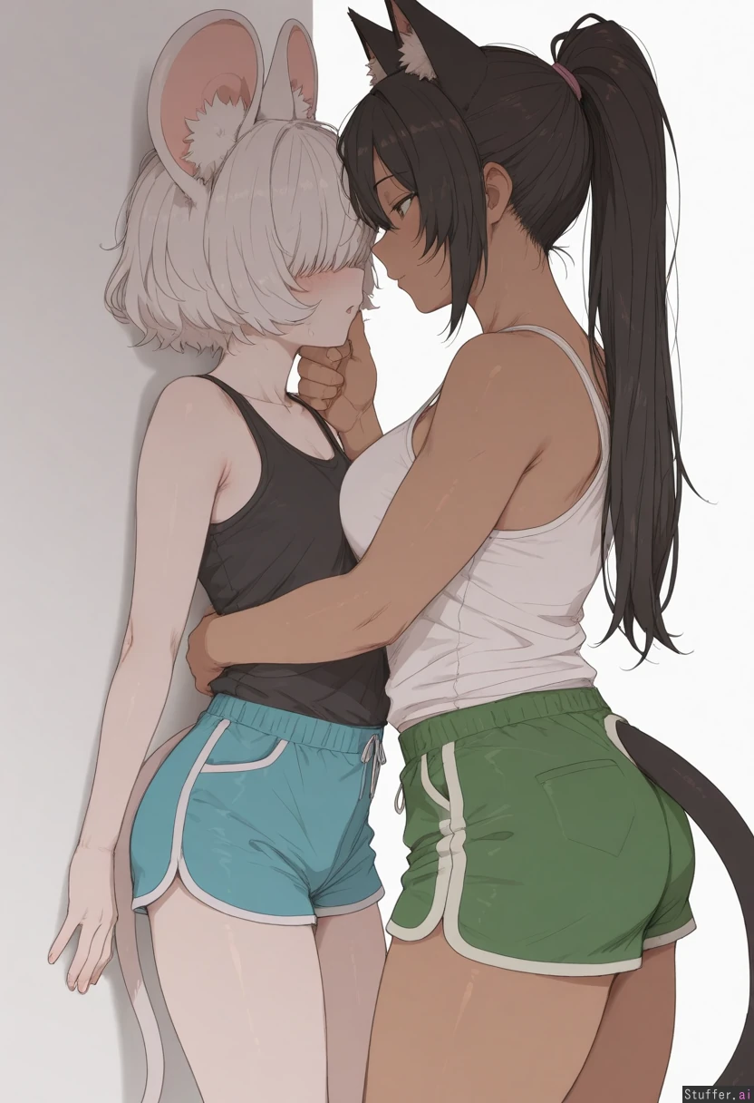 by mdf an, cowboy shot, simple background, 2woman, duo, animal ears, animal ears fluff, animal tail, yuri, dominant female, dark skin, curvy, long hair, ponytail, black hair, cat ears, cat tail, white tank top, blue shorts, grabbing_another's_chin, male chest, submissive against wall, looking at each other, submissive female, white skin, short hair, white hair, nervous, fluffy hair, bangs over eyes, mouse ears, mouse tail, black shirt, green shorts, male chest, highres, masterpiece, best quality, amazing quality,