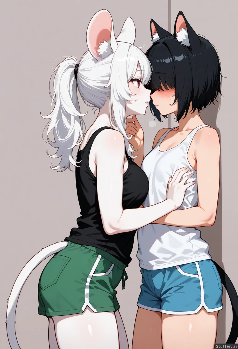 by daaku_(koizumi_arata), cowboy shot, simple background, 2woman, duo, animal ears, animal ears fluff, animal tail, yuri, adult, dominant female, black skin, curvy, long hair, ponytail, black hair, cat ears, cat tail, white tank top, blue shorts, grabbing_another's_chin, male chest, submissive against wall, looking at each other, submissive female, white skin, short hair, white hair, nervous, fluffy hair, bangs over eyes, mouse ears, mouse tail, black shirt, green shorts, male chest, highres, masterpiece, best quality, amazing quality,