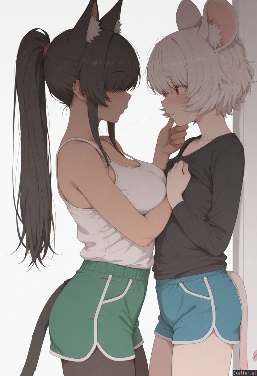 by mdf an, cowboy shot, simple background, 2woman, duo, animal ears, animal ears fluff, animal tail, yuri, adult, dominant female, black skin, curvy, long hair, ponytail, black hair, cat ears, cat tail, white tank top, blue shorts, grabbing_another's_chin, male chest, submissive against wall, looking at each other, submissive female, white skin, short hair, white hair, nervous, fluffy hair, bangs over eyes, mouse ears, mouse tail, black shirt, green shorts, male chest, highres, masterpiece, best quality, amazing quality,
