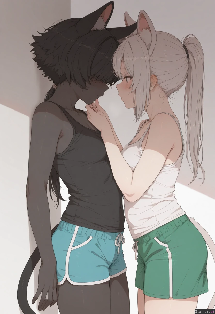 by mdf an, cowboy shot, simple background, 2woman, duo, animal ears, animal ears fluff, animal tail, yuri, adult, dominant female, black skin, curvy, long hair, ponytail, black hair, cat ears, cat tail, white tank top, blue shorts, grabbing_another's_chin, male chest, submissive against wall, looking at each other, submissive female, white skin, short hair, white hair, nervous, fluffy hair, bangs over eyes, mouse ears, mouse tail, black shirt, green shorts, male chest, highres, masterpiece, best quality, amazing quality,