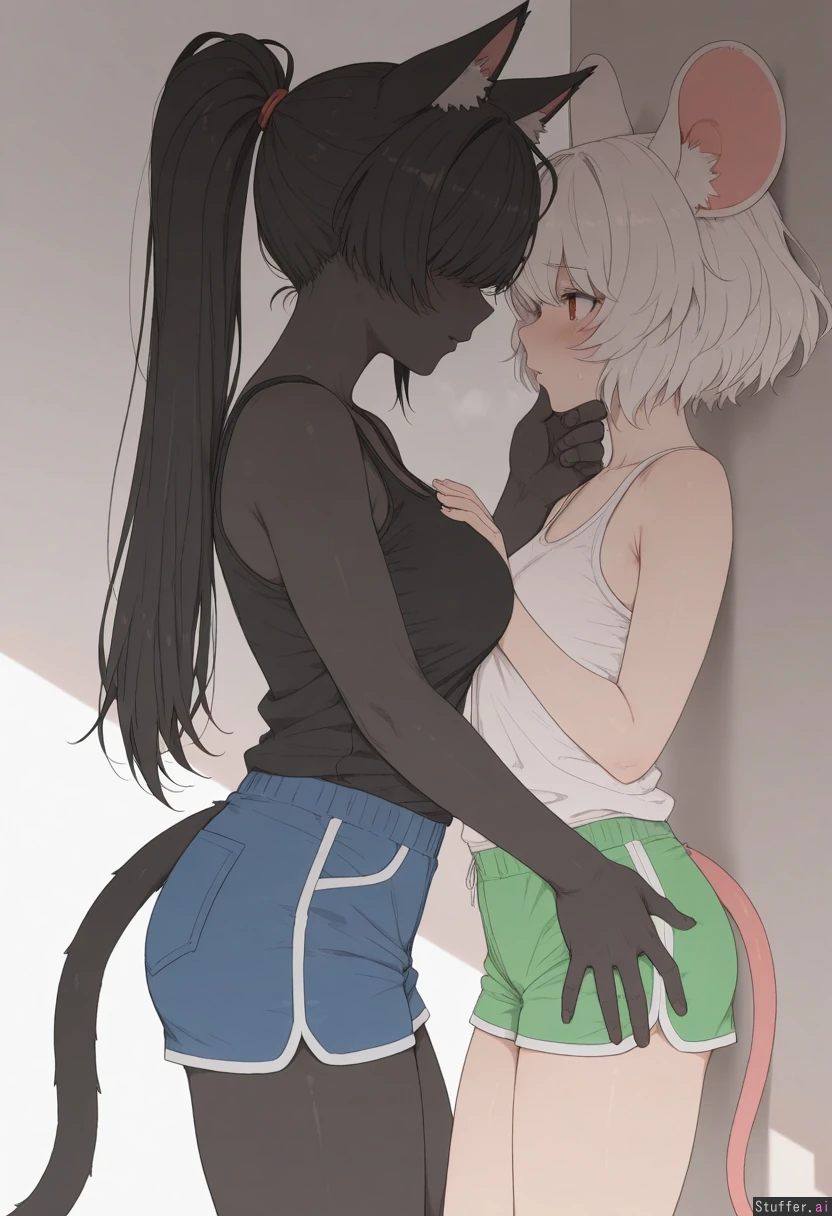 by mdf an, cowboy shot, simple background, 2woman, duo, animal ears, animal ears fluff, animal tail, yuri, adult, dominant female, black skin, curvy, long hair, ponytail, black hair, cat ears, cat tail, white tank top, blue shorts, grabbing_another's_chin, male chest, submissive against wall, looking at each other, submissive female, white skin, short hair, white hair, nervous, fluffy hair, bangs over eyes, mouse ears, mouse tail, black shirt, green shorts, male chest, highres, masterpiece, best quality, amazing quality,