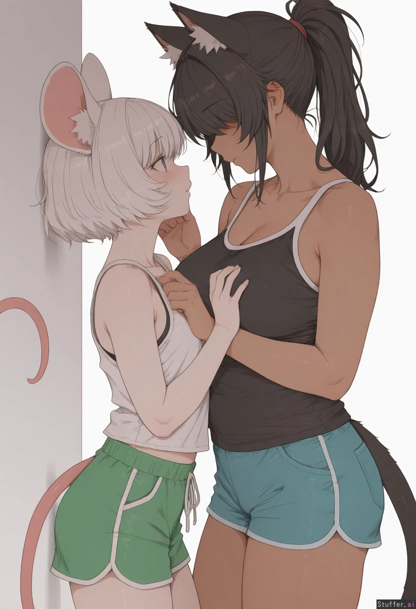 by mdf an, cowboy shot, simple background, 2woman, duo, animal ears, animal ears fluff, animal tail, yuri, adult, dominant female, dark skin, curvy, long hair, ponytail, black hair, (cat ears), cat tail, white tank top, blue shorts, grabbing_another's_chin, male chest, submissive against wall, looking at each other, submissive female, white skin, short hair, white hair, nervous, fluffy hair, bangs over eyes, (mouse ears), mouse tail, black shirt, green shorts, male chest, highres, masterpiece, best quality, amazing quality,