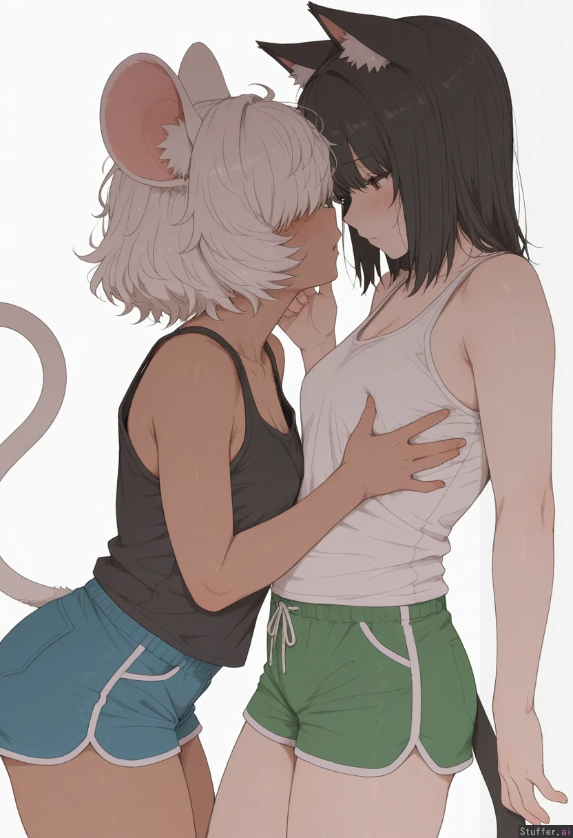 by mdf an, cowboy shot, simple background, 2woman, duo, animal ears, animal ears fluff, animal tail, yuri, adult, dominant female, dark skin, curvy, medium hair, black hair, (cat ears), cat tail, white tank top, blue shorts, grabbing_another's_chin, male chest, submissive against wall, looking at each other, submissive female, white skin, short hair, white hair, nervous, fluffy hair, bangs over eyes, (mouse ears), mouse tail, black shirt, green shorts, male chest, highres, masterpiece, best quality, amazing quality,