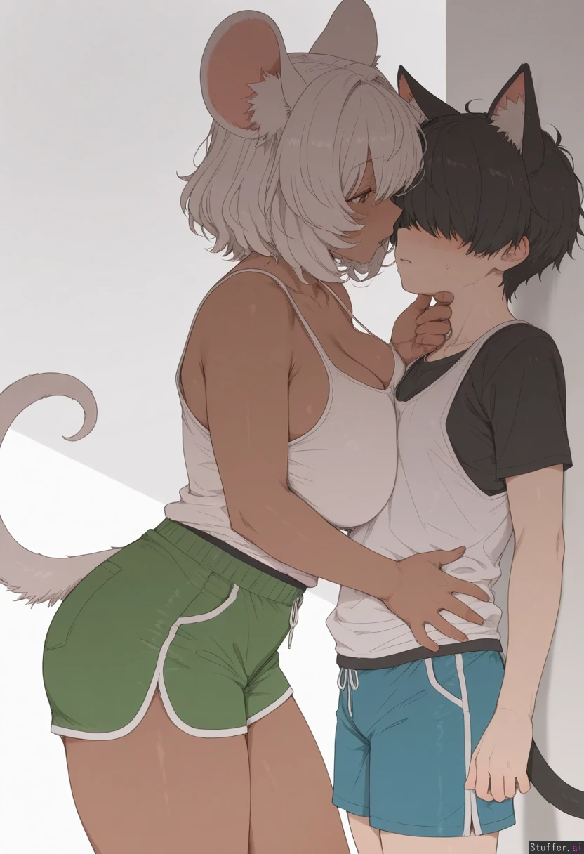 by mdf an, cowboy shot, simple background, 2woman, duo, animal ears, animal ears fluff, animal tail, yuri, adult, dominant female, dark skin, curvy, medium hair, black hair, (cat ears), cat tail, white tank top, blue shorts, grabbing_another's_chin, male chest, submissive against wall, looking at each other, submissive female, white skin, short hair, white hair, nervous, fluffy hair, bangs over eyes, (mouse ears), mouse tail, black shirt, green shorts, male chest, highres, masterpiece, best quality, amazing quality,
