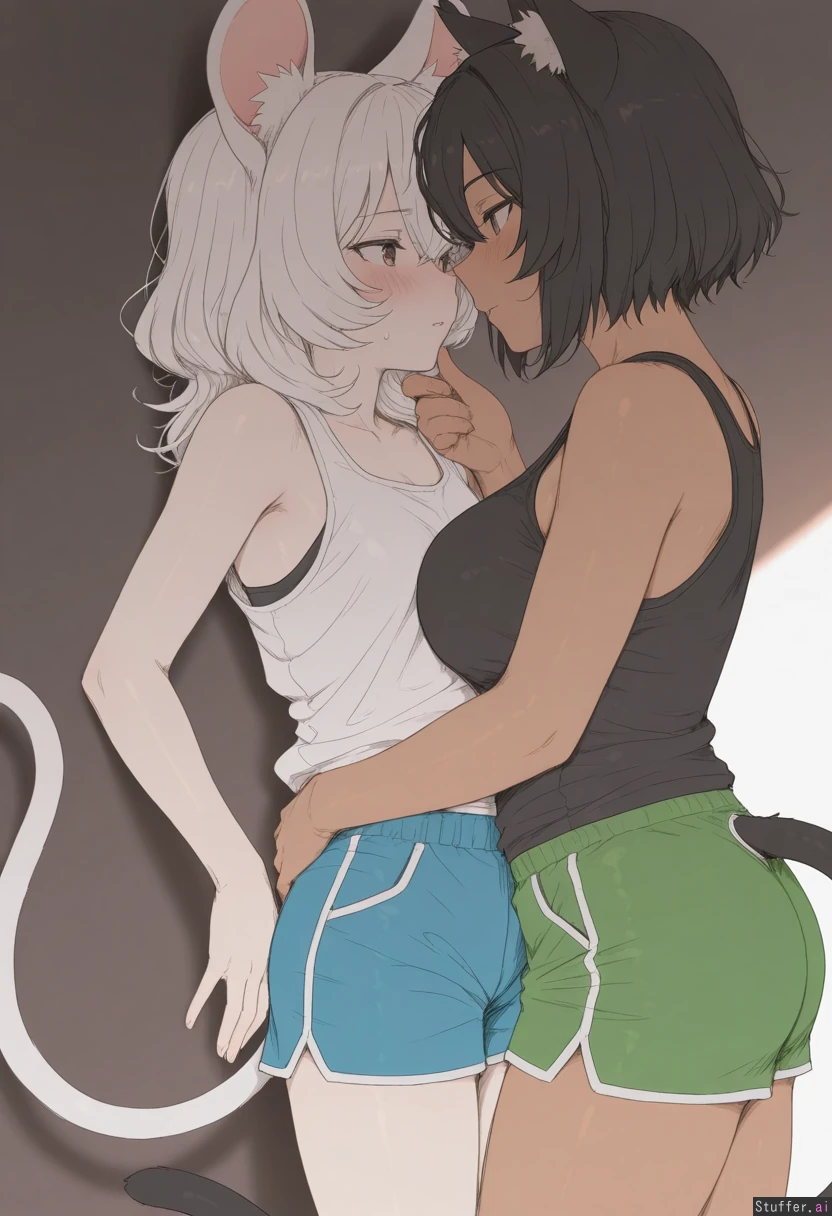 ((by mdf an)), cowboy shot, simple background, 2woman, duo, animal ears, animal ears fluff, animal tail, yuri, adult, dominant female, dark skin, curvy, medium hair, black hair, (cat ears), cat tail, white tank top, blue shorts, grabbing_another's_chin, male chest, submissive against wall, looking at each other, submissive female, white skin, short hair, white hair, nervous, fluffy hair, bangs over eye, (mouse ears), mouse tail, black shirt, green shorts, male chest, highres, masterpiece, best quality, amazing quality,