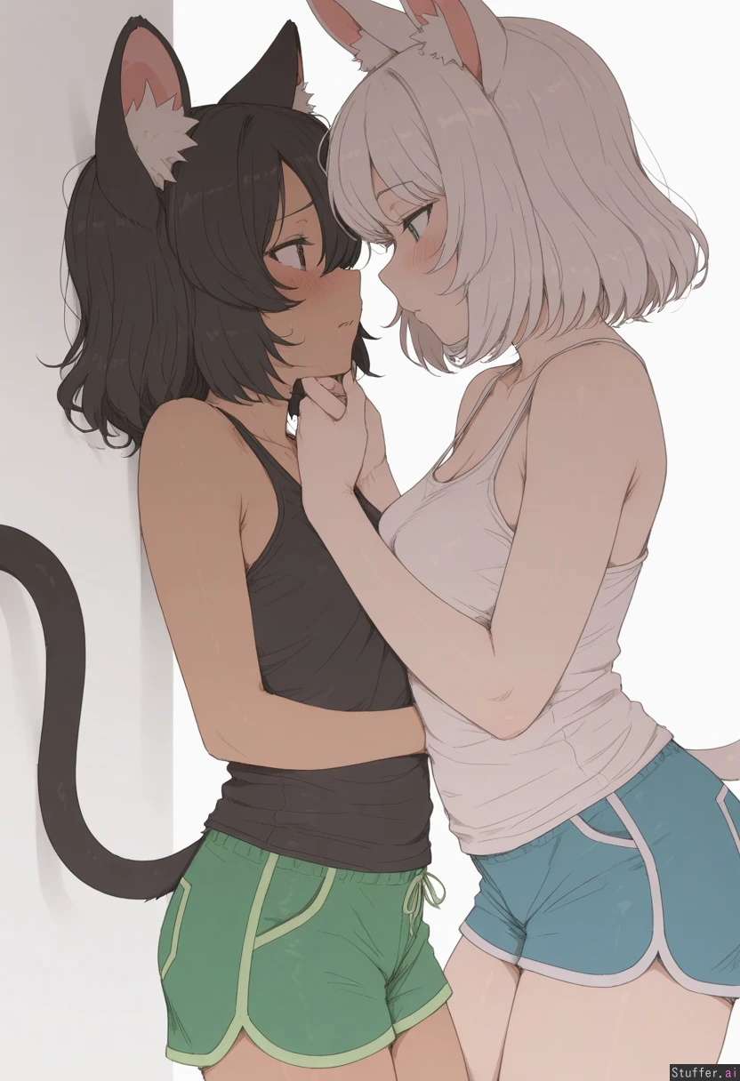 ((by mdf an)), cowboy shot, simple background, 2woman, duo, animal ears, animal ears fluff, animal tail, yuri, adult, female, dark skin, curvy, medium hair, black hair, (cat ears), cat tail, white tank top, blue shorts, grabbing_another's_chin, male chest, submissive against wall, looking at each other, submissive female, white skin, short hair, white hair, nervous, fluffy hair, bangs over eye, (mouse ears), mouse tail, black shirt, green shorts, male chest, highres, masterpiece, best quality, amazing quality,