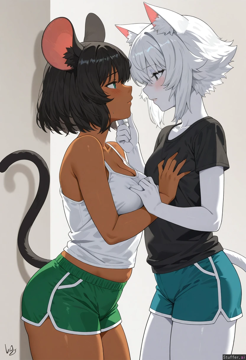 ((by club3)), cowboy shot, simple background, 2woman, duo, animal ears, animal ears fluff, animal tail, yuri, adult, female, dark skin, curvy, medium hair, black hair, (cat ears), cat tail, white tank top, blue shorts, grabbing_another's_chin, male chest, submissive against wall, looking at each other, submissive female, white skin, short hair, white hair, nervous, fluffy hair, bangs over eye, (mouse ears), mouse tail, black shirt, green shorts, male chest, highres, masterpiece, best quality, amazing quality,