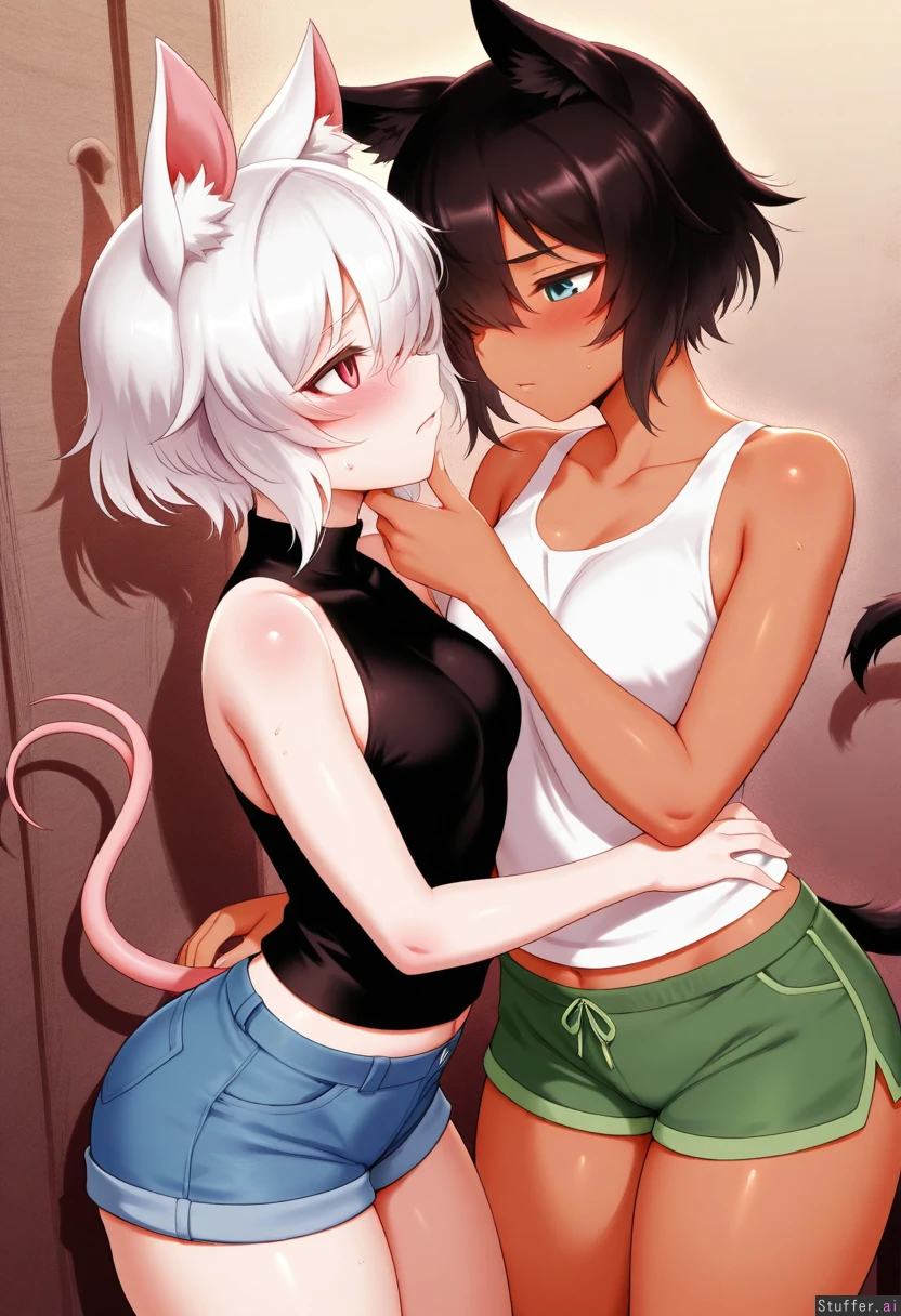 ((by m-da_s-tarou)), cowboy shot, simple background, 2woman, duo, animal ears, animal ears fluff, animal tail, yuri, adult, female, dark skin, curvy, medium hair, black hair, (cat ears), cat tail, white tank top, blue shorts, grabbing_another's_chin, male chest, submissive against wall, looking at each other, submissive female, white skin, short hair, white hair, nervous, fluffy hair, bangs over eye, (mouse ears), mouse tail, black shirt, green shorts, male chest, highres, masterpiece, best quality, amazing quality,