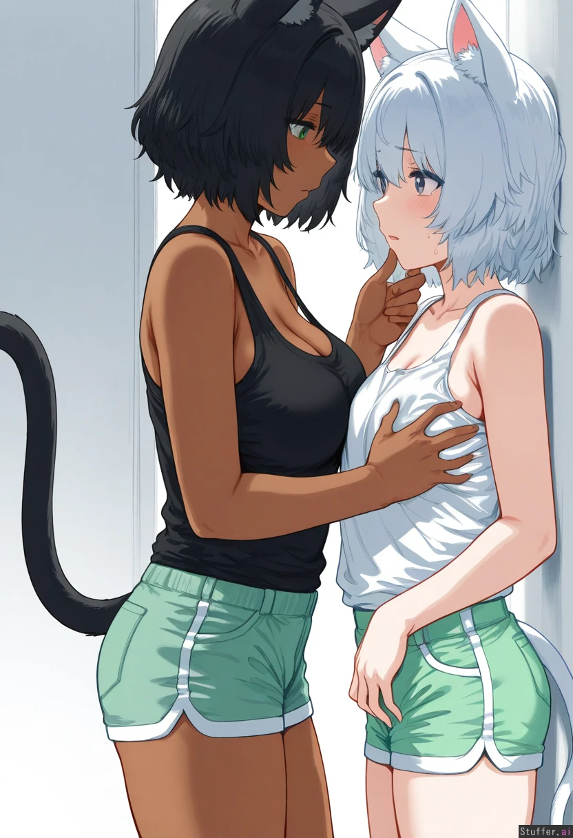 ((by hews)), cowboy shot, side view, simple background, 2woman, duo, animal ears, animal ears fluff, animal tail, yuri, adult, female, dark skin, curvy, medium hair, black hair, (cat ears), cat tail, white tank top, blue shorts, grabbing_another's_chin, male chest, submissive against wall, looking at each other, submissive female, white skin, short hair, white hair, nervous, fluffy hair, bangs over eye, (mouse ears), mouse tail, black shirt, green shorts, male chest, highres, masterpiece, best quality, amazing quality,