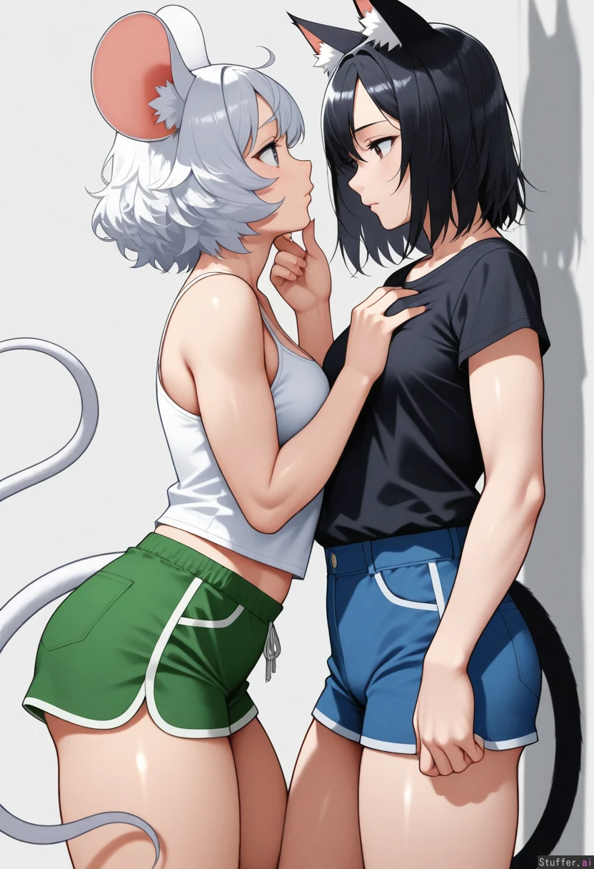 ((by yoshio_(55level))), cowboy shot, side view, simple background, 2woman, duo, animal ears, animal ears fluff, animal tail, yuri, adult, female, dark skin, curvy, medium hair, black hair, (cat ears), cat tail, white tank top, blue shorts, grabbing_another's_chin, male chest, submissive against wall, looking at each other, submissive female, white skin, short hair, white hair, nervous, fluffy hair, bangs over eye, (mouse ears), mouse tail, black shirt, green shorts, male chest, highres, masterpiece, best quality, amazing quality,