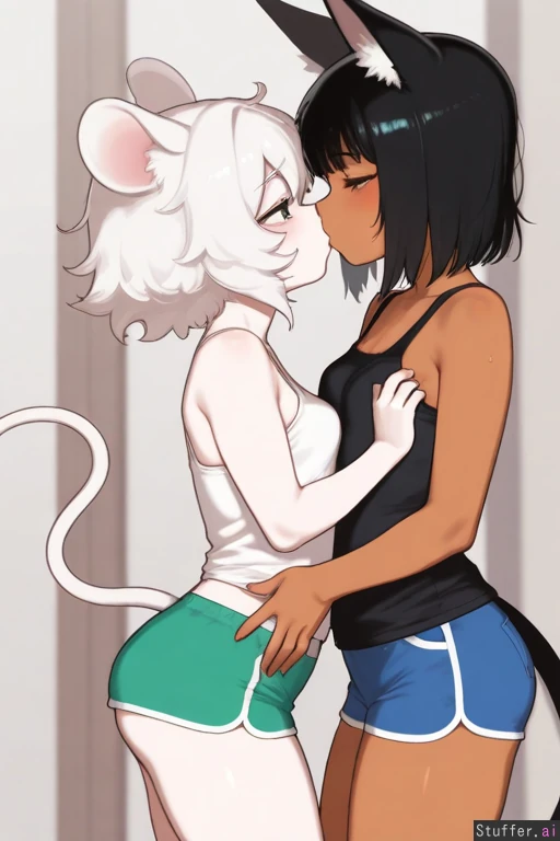 ((by atte_nanakusa)), cowboy shot, side view, simple background, 2woman, duo, animal ears, animal ears fluff, animal tail, yuri, adult, female, dark skin, curvy, medium hair, black hair, (cat ears), cat tail, white tank top, blue shorts, grabbing_another's_chin, male chest, seductive, submissive against wall, looking at each other, love, kissing, submissive female, white skin, short hair, white hair, nervous, fluffy hair, bangs over eye, (mouse ears), mouse tail, black shirt, green shorts, male chest, highres, masterpiece, best quality, amazing quality,