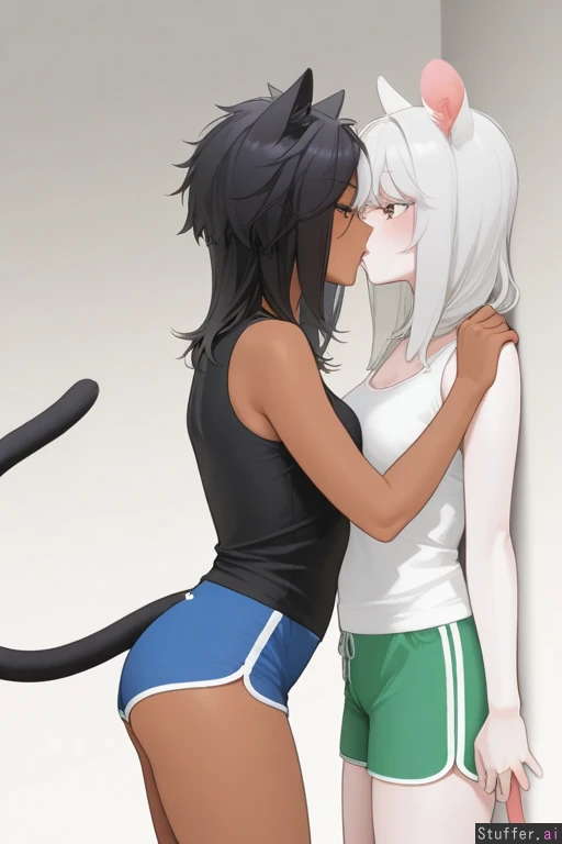 ((by ohisashiburi)), cowboy shot, side view, simple background, 2woman, duo, animal ears, animal ears fluff, animal tail, yuri, adult, female, dark skin, curvy, medium hair, black hair, (cat ears), cat tail, white tank top, blue shorts, grabbing_another's_chin, male chest, seductive, submissive against wall, looking at each other, love, kissing, submissive female, white skin, medium hair, white hair, nervous, fluffy hair, bangs over eye, (mouse ears), mouse tail, black shirt, green shorts, male chest, highres, masterpiece, best quality, amazing quality,