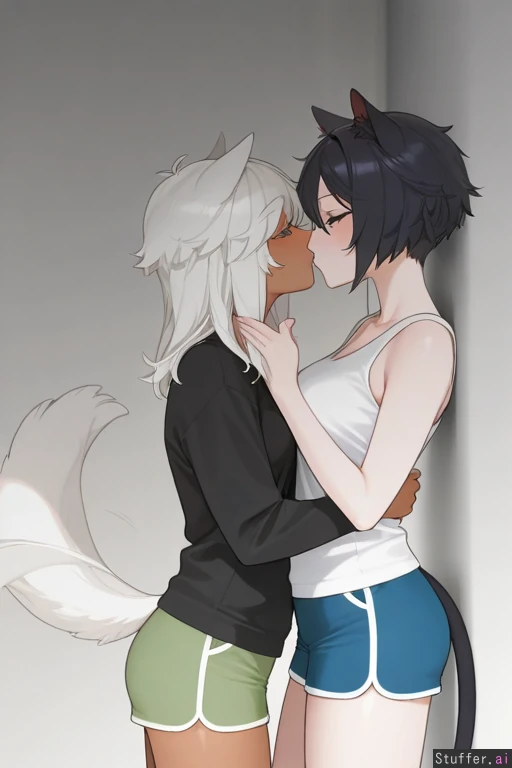 ((by ohisashiburi)), cowboy shot, side view, simple background, 2woman, duo, animal ears, animal ears fluff, animal tail, yuri, adult, female, dark skin, curvy, medium hair, black hair, (cat ears), cat tail, white tank top, blue shorts, grabbing_another's_chin, male chest, seductive, submissive against wall, looking at each other, love, kissing, tail wagging, closed eyes, submissive female, white skin, medium hair, white hair, nervous, fluffy hair, bangs over eye, (mouse ears), mouse tail, black shirt, green shorts, male chest, highres, masterpiece, best quality, amazing quality,