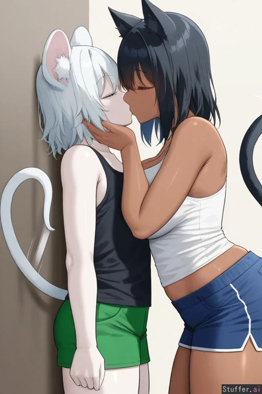 ((by oekakizuki)), cowboy shot, side view, simple background, 2woman, duo, animal ears, animal ears fluff, animal tail, yuri, 2adult, petite, female, dark skin, medium hair, black hair, (cat ears), cat tail, white tank top, blue shorts, grabbing_another's_chin, male chest, seductive, submissive against wall, looking at each other, love, kissing, tail wagging, closed eyes, submissive female, white skin, medium hair, white hair, fluffy hair, (mouse ears), mouse tail, black shirt, green shorts, male chest, highres, masterpiece, best quality, amazing quality,