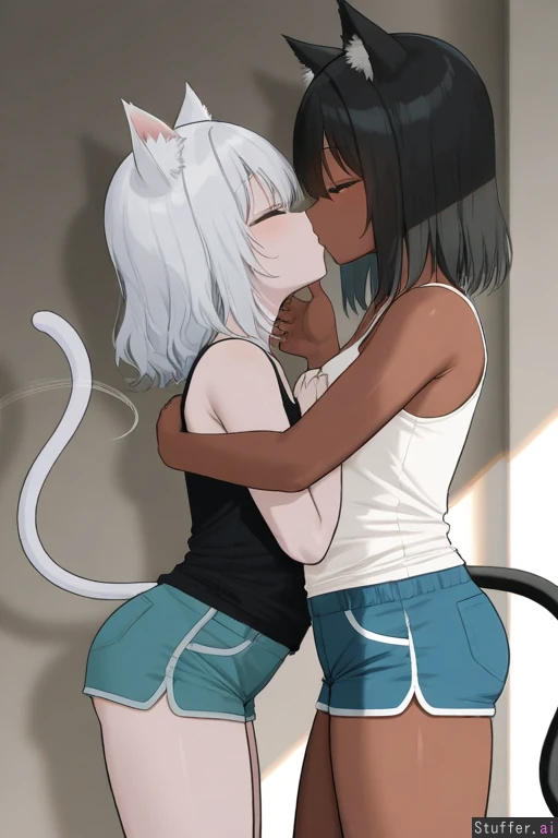 ((by oekakizuki)), cowboy shot, side view, simple background, 2woman, duo, animal ears, animal ears fluff, animal tail, yuri, petite, female, dark skin, medium hair, black hair, (cat ears), cat tail, white tank top, blue shorts, grabbing_another's_chin, petite, submissive against wall, looking at each other, love, kissing, tail wagging, closed eyes, submissive female, white skin, medium hair, white hair, fluffy hair, rat ears, mouse tail, black shirt, green shorts, petite, highres, masterpiece, best quality, amazing quality,