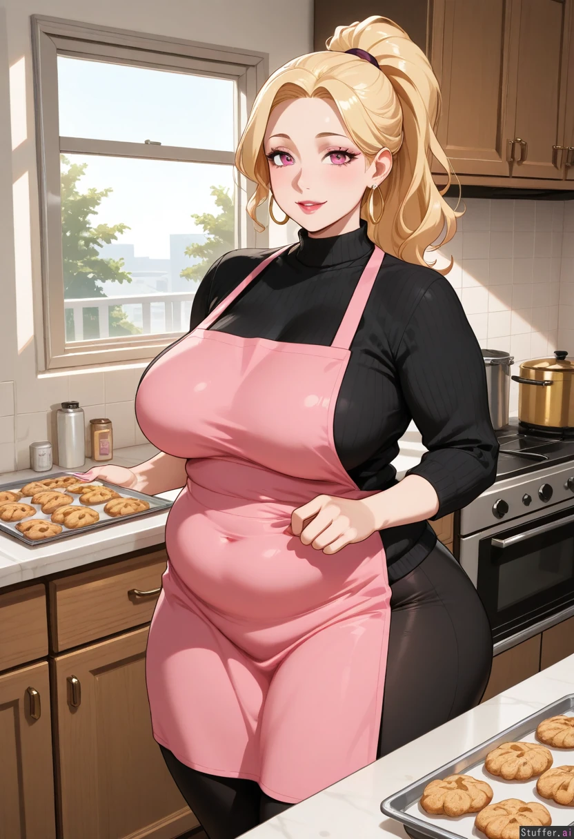 Mature female, slender figure, chubby mom-bod, medium_breasts, big_fat_saggy_ass, long blonde ponytail, pink almond eyes, lipstick, long_lashes, pink painted_nails, gold hoop earrings, pink apron, baking cookies, kitchen, smile, window, black sweater, black leggings (Substantial Weight gain),