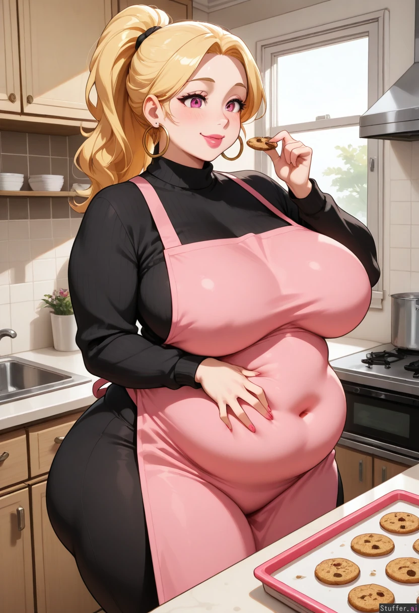 Mature female, slender figure, chubby mom-bod, medium_breasts, big_fat_saggy_ass, long blonde ponytail, pink almond eyes, lipstick, long_lashes, pink painted_nails, gold hoop earrings, pink apron, baking cookies, eating a cookie, kitchen, smile, window, black sweater, black leggings (Substantial Weight gain, chubby tummy),