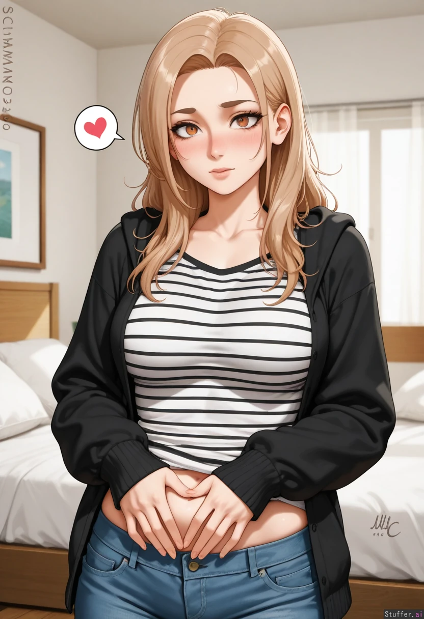 Sciamano240(artist), (solo), young woman, soft oval face, slightly heart-shaped, almond-shaped hazel eyes, slightly hooded eyelids, subtle downturned outer corners, natural medium-thickness eyebrows with soft arch, straight narrow nose, small rounded tip, natural lips (slightly fuller lower lip), light warm-neutral skin tone, smooth natural skin texture, dark blonde/light brown hair with warm highlights, medium-long hair past shoulders, slightly wavy, soft layers, center part, slim petite build, chubby belly bulge, wearing black cardigan over black-and-white striped shirt, open jeans, casual cozy outfit, soft natural lighting, bedroom, (hand_on_tummy), embarrassed, blushing, shocked,